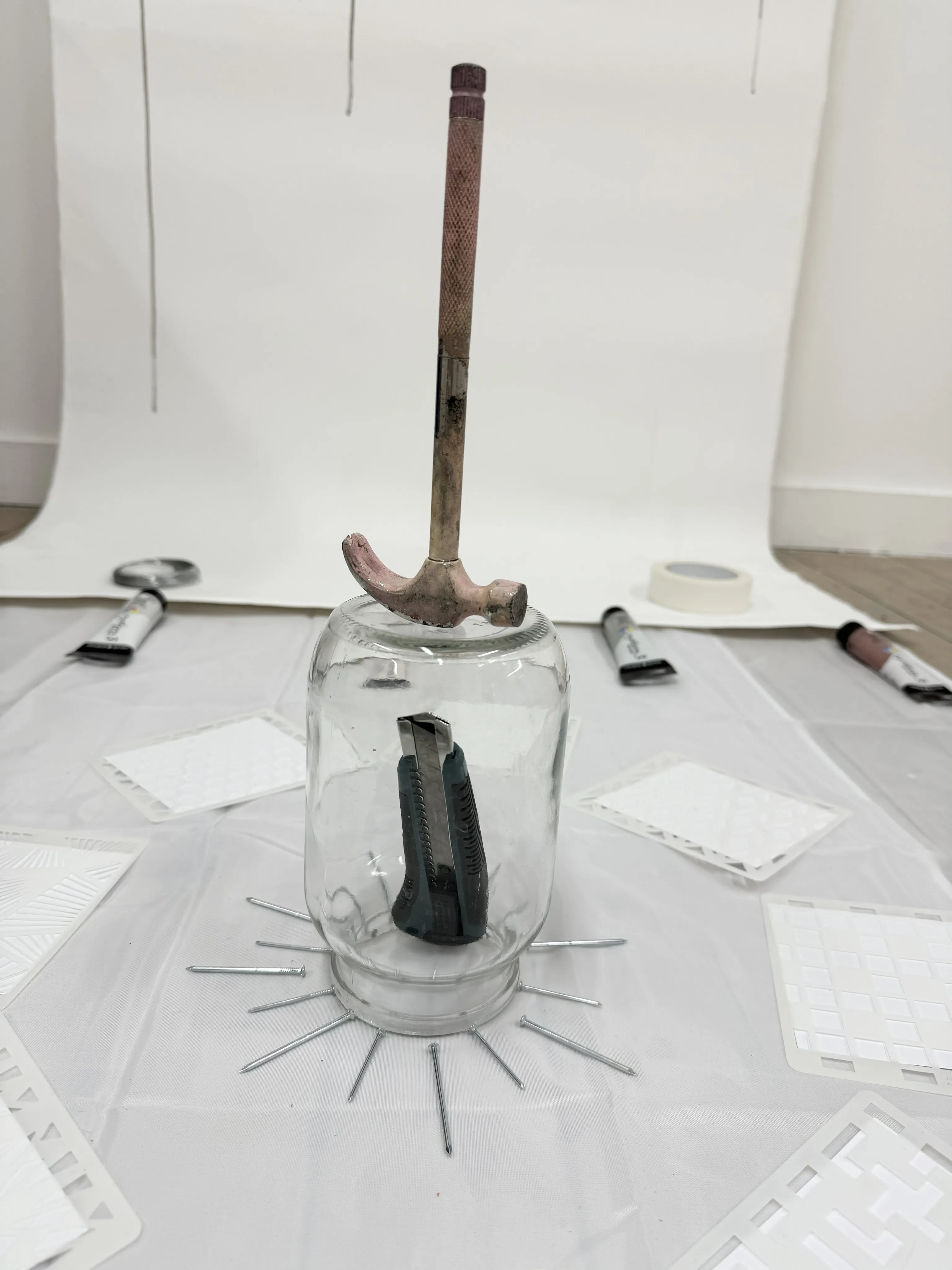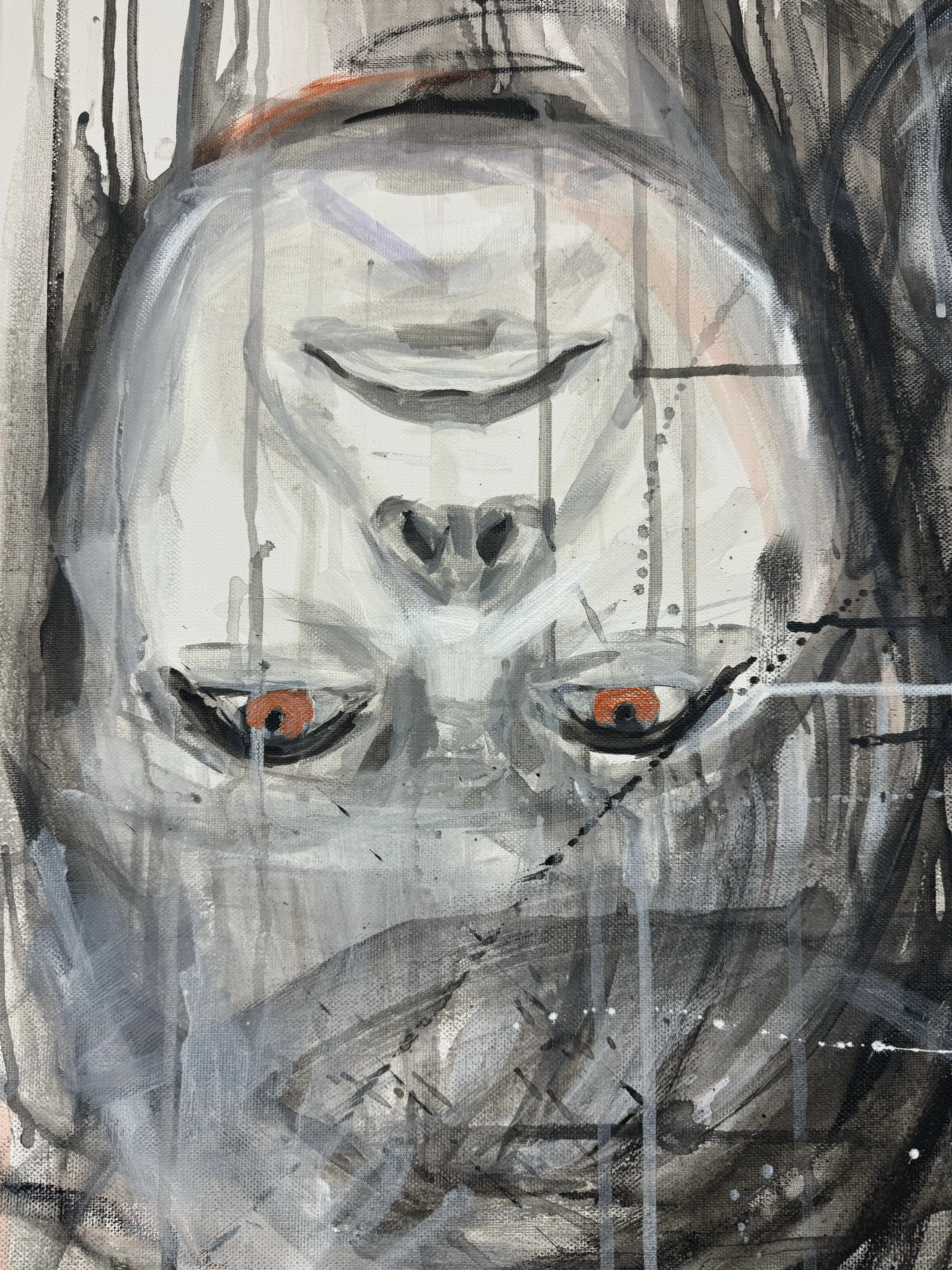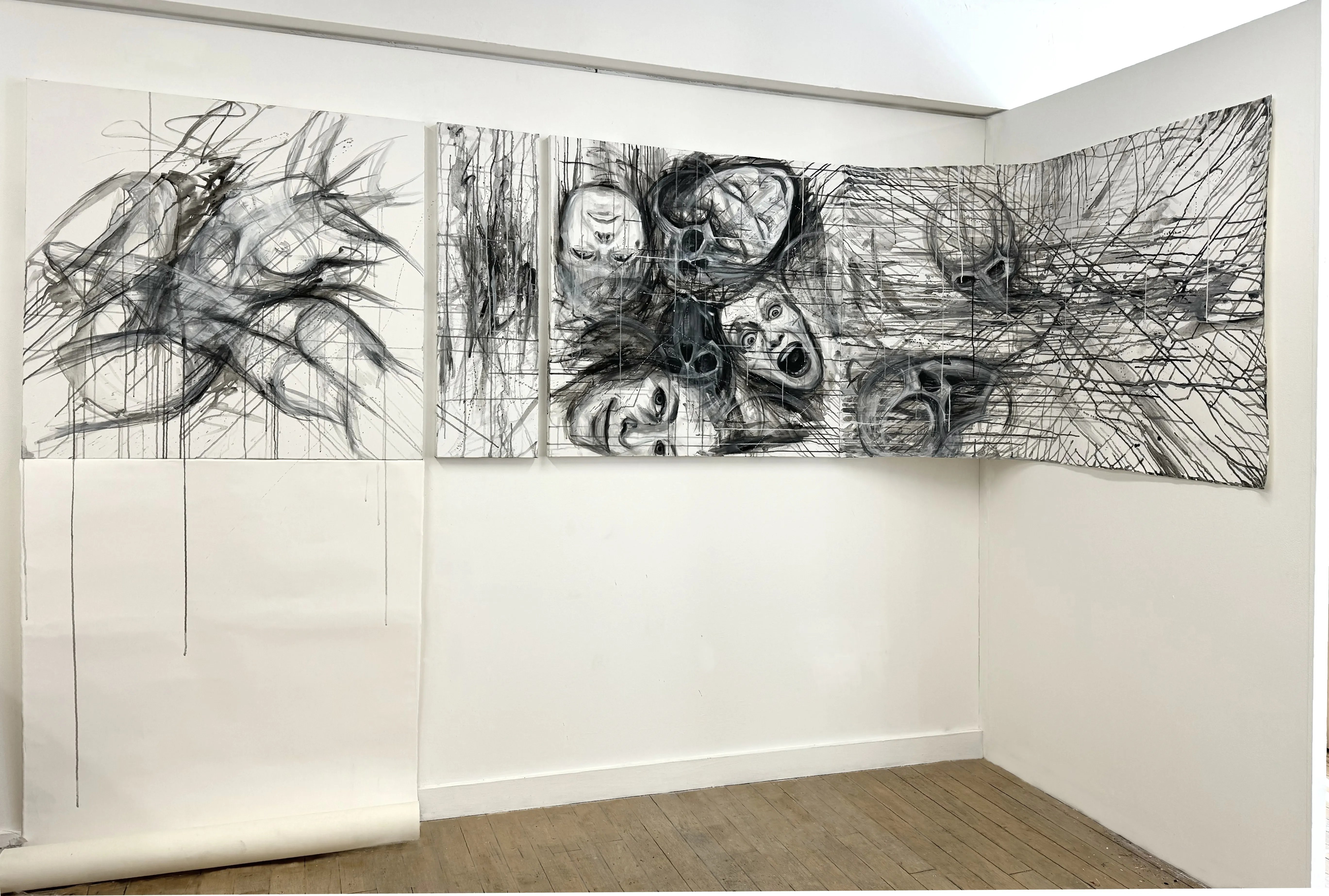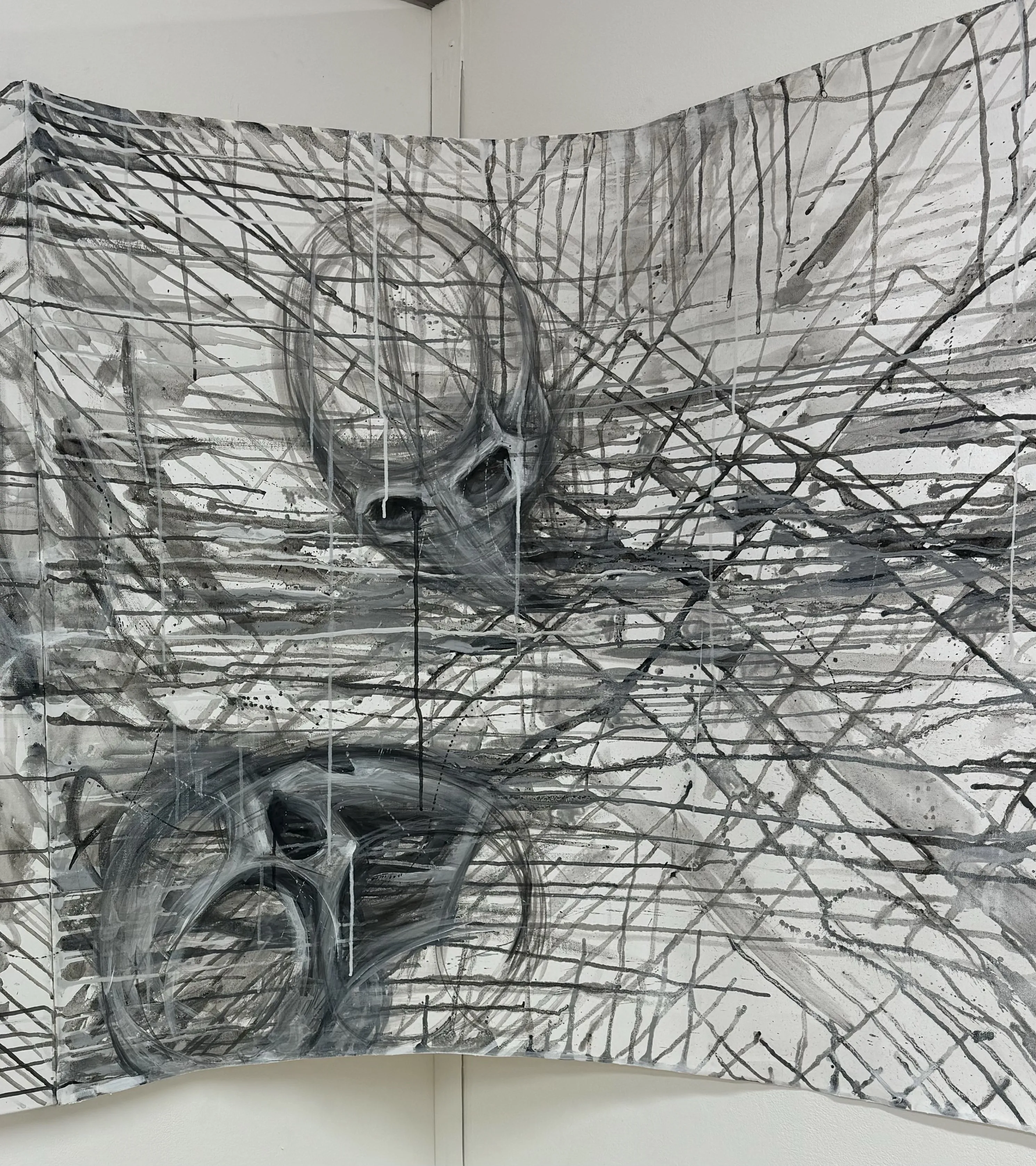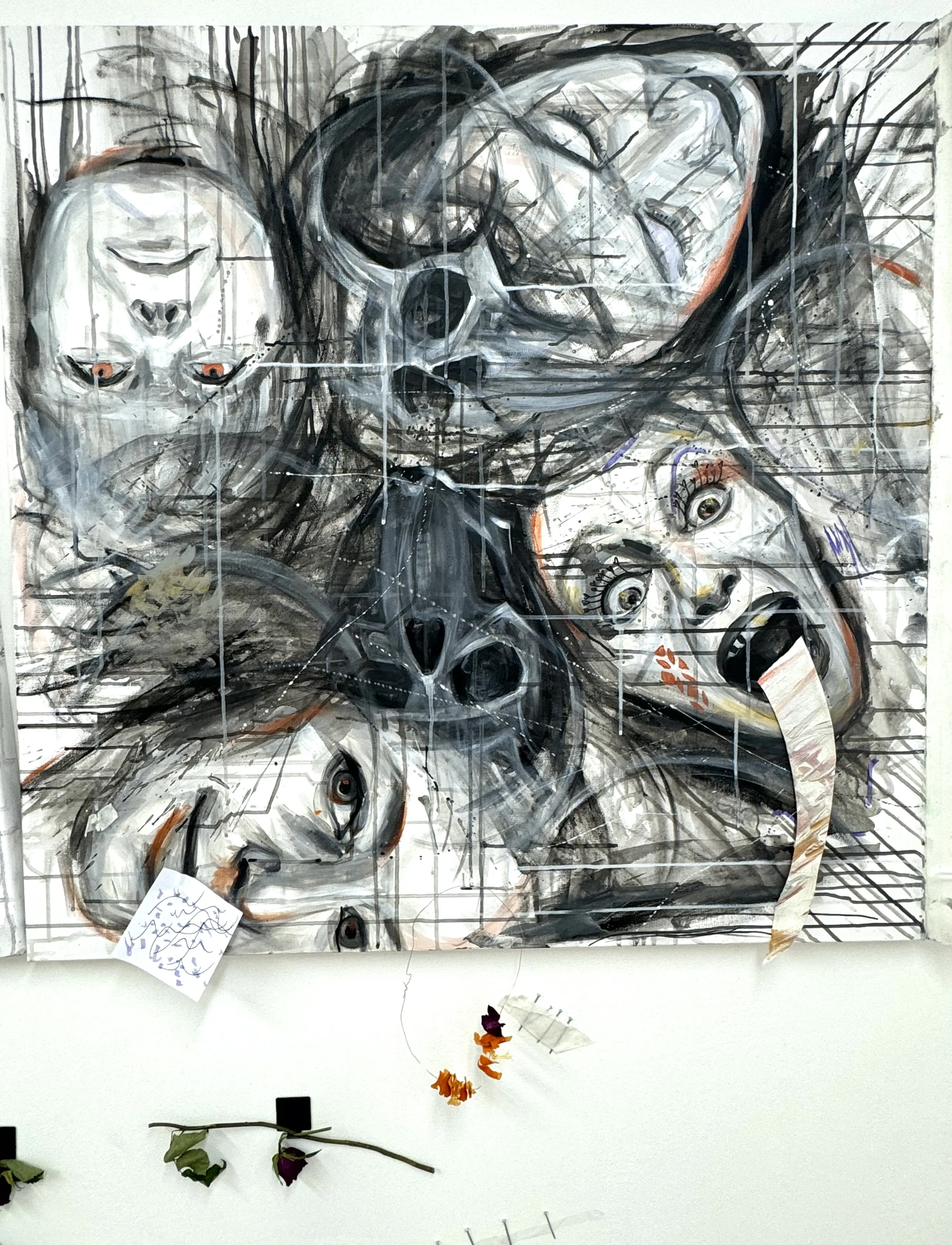 Where Are You? ( 2025) is an interactive installation that tests the boundary between artist and viewer. Canvases with fragments of faces, bodies, and skulls, together with an almost empty canvas, create a site for intervention. The provided tools transform the audience into co-creators: each gesture leaves a mark, shifting the work from individual to collective.