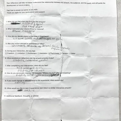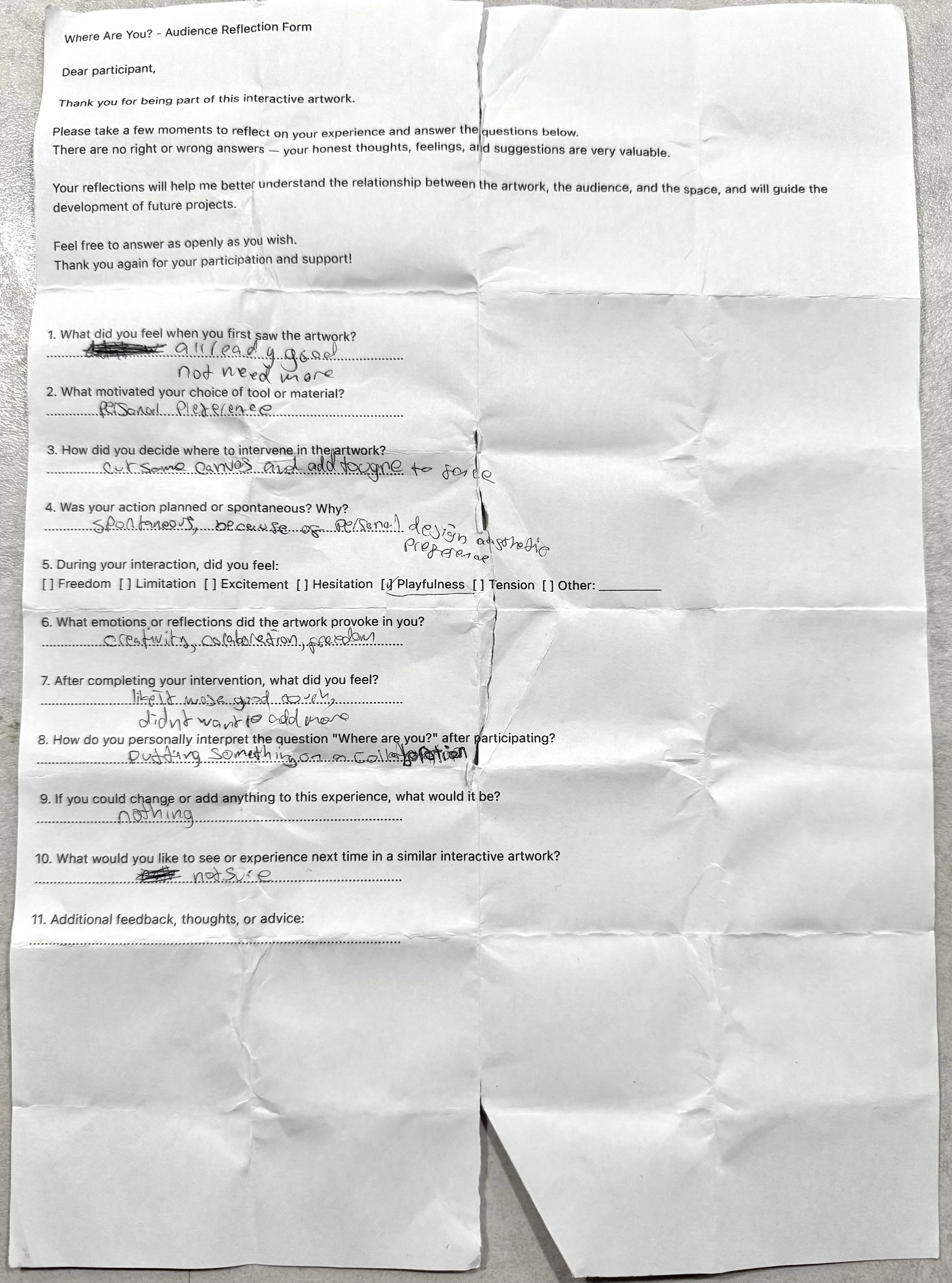 The project also reflects on the artist’s ego, questioning ownership, control, and permission. Stepping away from the canvas becomes an act of trust and release. Participant reflections further extended the installation into a field of dialogue, where art exists as process rather than finished form.